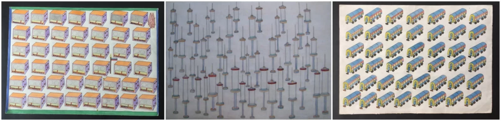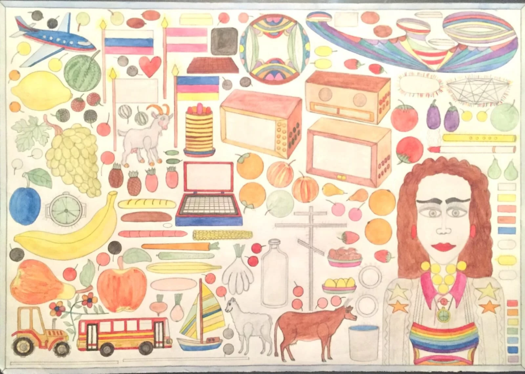 — Эти сорок четыре предмета, — рассказывает Александра, — он рисует одинаковыми, а потом перечисляет на обороте. Сорок четыре солнца или сорок четыре минерала — а рядом могут быть ещё женщины или животные.