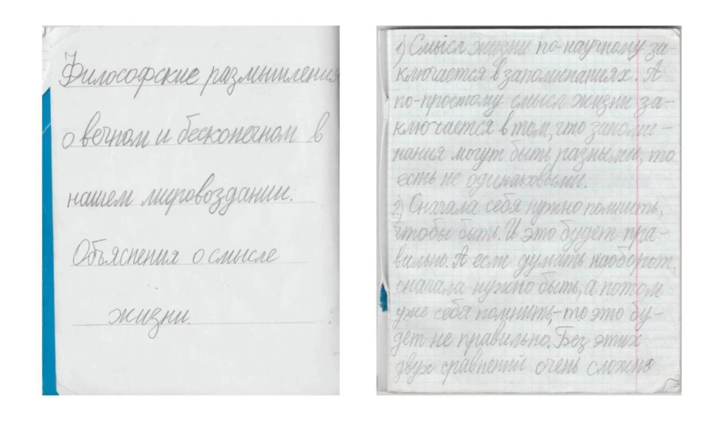 Пять лет назад Хаткевич передал Александре тетрадь, озаглавленную как «Философские размышления о вечном-бесконечном нашем мироздании, объяснение смысла жизни». В этом небольшом трактате он, в частности, пишет, что у человека есть несколько видов памяти — живая и неживая. «Сначала себя нужно помнить, чтобы быть, и это будет правильно. А если думать наоборот — что сначала нужно быть, а потом уже себя помнить — это будет неправильно».