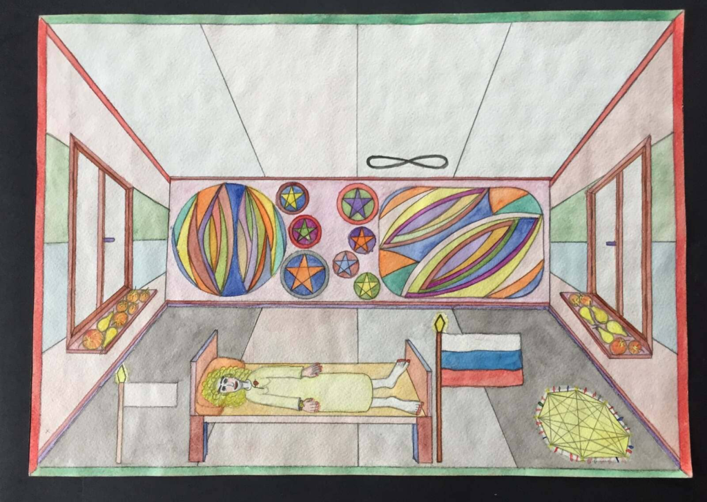 Оказалось, что работы на детскую конференцию принёс Михаил Солдатенков — один из школьных преподавателей, который помимо школы работал ещё и в психиатрической лечебнице Черняховска, где занимался с пациентами чем-то вроде арт-терапии. «Чем-то вроде» — потому что арт-терапией в полном смысле слова это назвать было нельзя, в России она тогда в принципе была не особенно развита, поэтому правильнее было назвать его просто художником-инструктором. Солдатенков, который с уважением относился к творчеству подопечных и пользовался возможностью явить его миру, рассказал Александре, что эти работы принадлежат одному из пациентов больницы, — причём, кажется, был не особо рад этому факту. Рядом с загадочными работами висела довольно наивная копия картины «Явление Христа народу», тоже рождённая в недрах лечебницы, и ею преподаватель явно гордился гораздо больше: её автор сначала рисовал «всякий кошмар», а потом его удалось «вдохновить и переучить».