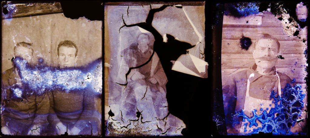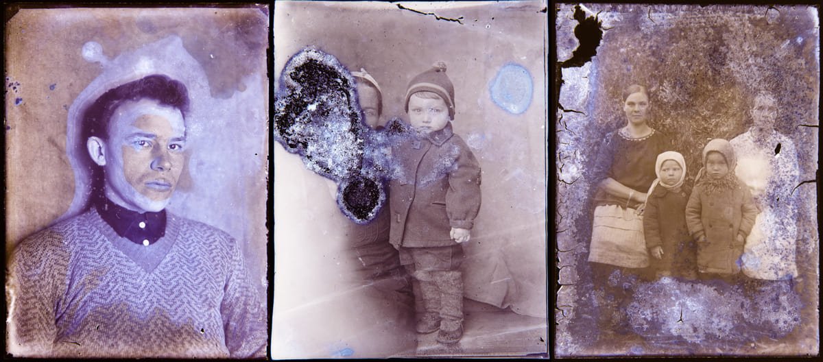 Тогда я опустилась на пол, стала осторожно расчищать солому и мусор в поисках других негативов (в начале прошлого века снимали на стёкла, на которые наносилась фотоэмульсия). Большая часть стёклышек лежала на чердаке в коробке: одни сохранились хорошо, другие из-за попадания влаги слиплись, с некоторых эмульсия свисала тонкой сморщившейся плёнкой.