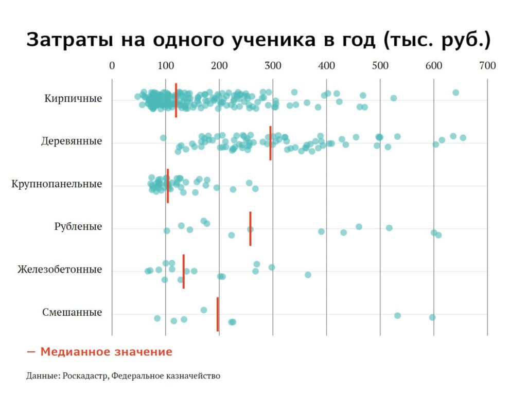 Стены ещё одного процента школ — «бетонные». Но речь, по всей видимости, идет про бетонные доски: «бетонное» формально и здание луговской школы — при этом в одном из отчётов районной администрации она называется деревянной. В некоторых других регионах школ из дерева ещё больше. Так, в Якутии, в Коми и в Тыве, судя по исследованию Высшей школы экономики, их около 70%.