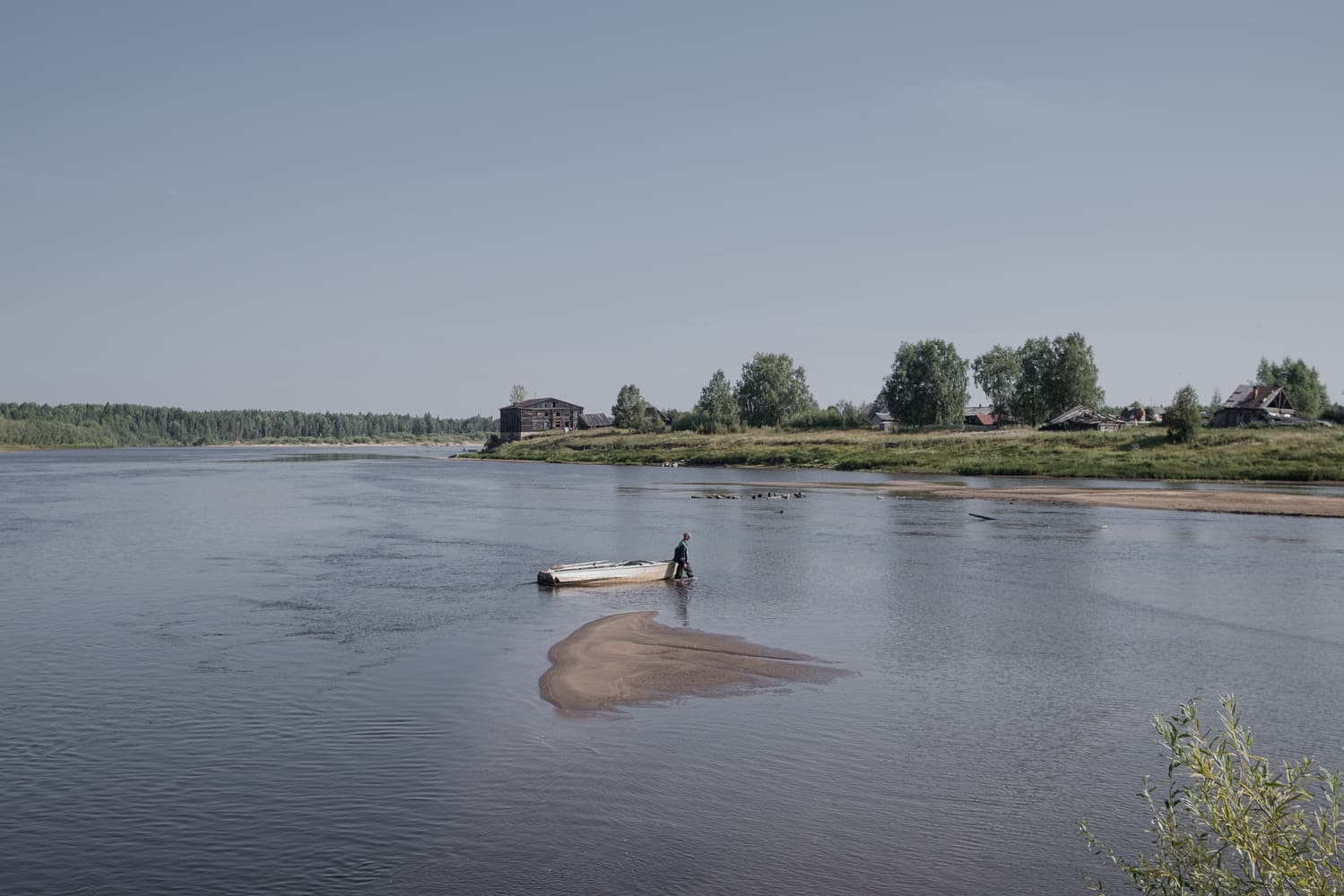 Мы слышим вёсельный скрип. За нами, по просьбе Арины, выплыл друг их семьи, бывший местный житель Денис Дроздов. Он приезжает сюда с дочками во время своего отпуска, теперь уже как дачник. Правда, путь от Перми неблизкий — почти 400 километров. «Здесь хорошо на самом деле», — говорит Денис и налегает на вёсла.