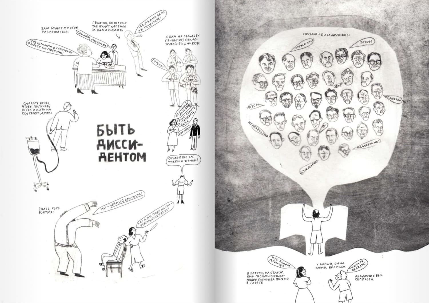 Когда она впервые пришла в «Мемориал» за консультацией для своего графического романа про Сахарова, то сказала, что хочет посвятить его тому, как люди справлялись с репрессиями. «И мне сказали: „Да, супер, отлично! Это и наша тактика тоже“», — рассказывает художница.